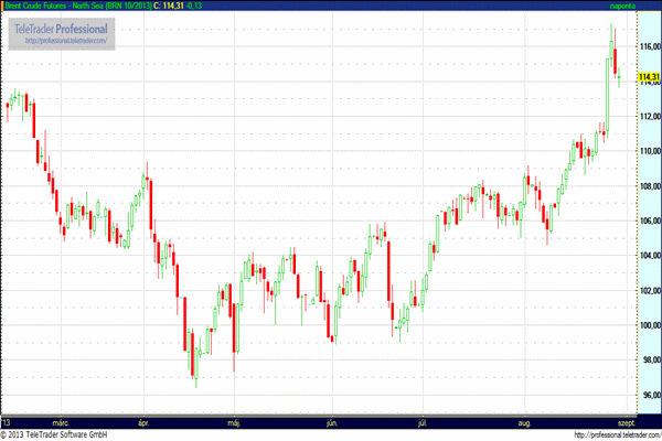 Az októberi szállítású északi-tengeri Brent olajfajta árfolyama 86 centes, 0,75 százalékos csökkenéssel 114,31 dollárra ereszkedett az ICE határidős jegyzésében.
