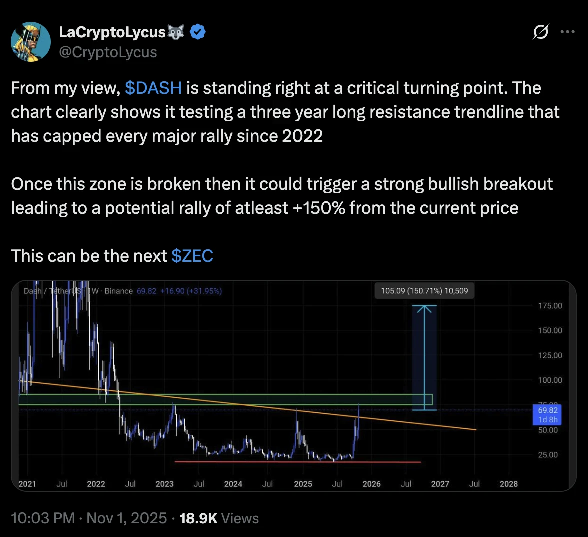 2. Dash (DASH) – Hároméves ellenállási szintet tesztel, az elemzők pedig újabb 150%-os árfolyam-emelkedést várnak, miközben a felhasználók egyre inkább keresik a pénzügyi anonimitást.