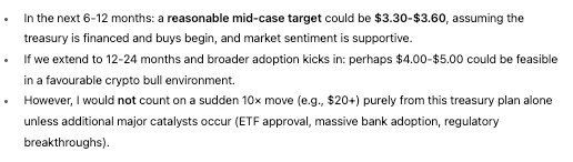 A modell azonban nem esett túlzottan a Ripple körüli hírek hatására gyakran felmerülő eufórikus várakozások csapdájába. Az elemzők úgy vélik, hogy a Ripple hatása az XRP értékelésére inkább attól függ majd, milyen hatékonyan hajtja végre a vállalati kincstár által fedezett felvásárlási tervét, mintsem a körülötte kialakuló hírveréstől. A gyakran emlegetett 20 dolláros célár eléréséhez jóval többre lenne szükség egy vállalati kincstári tervnél.