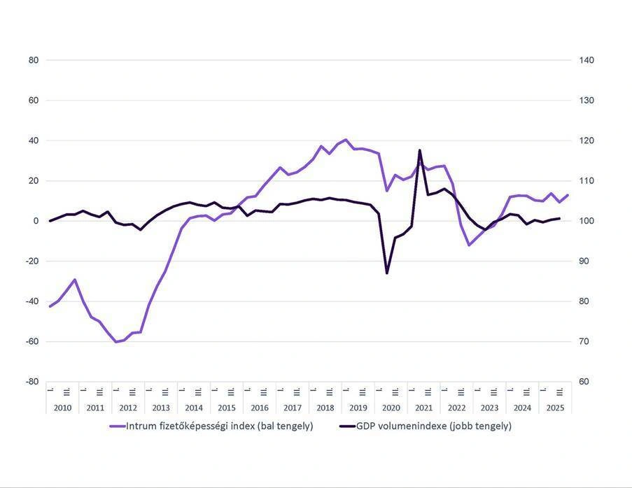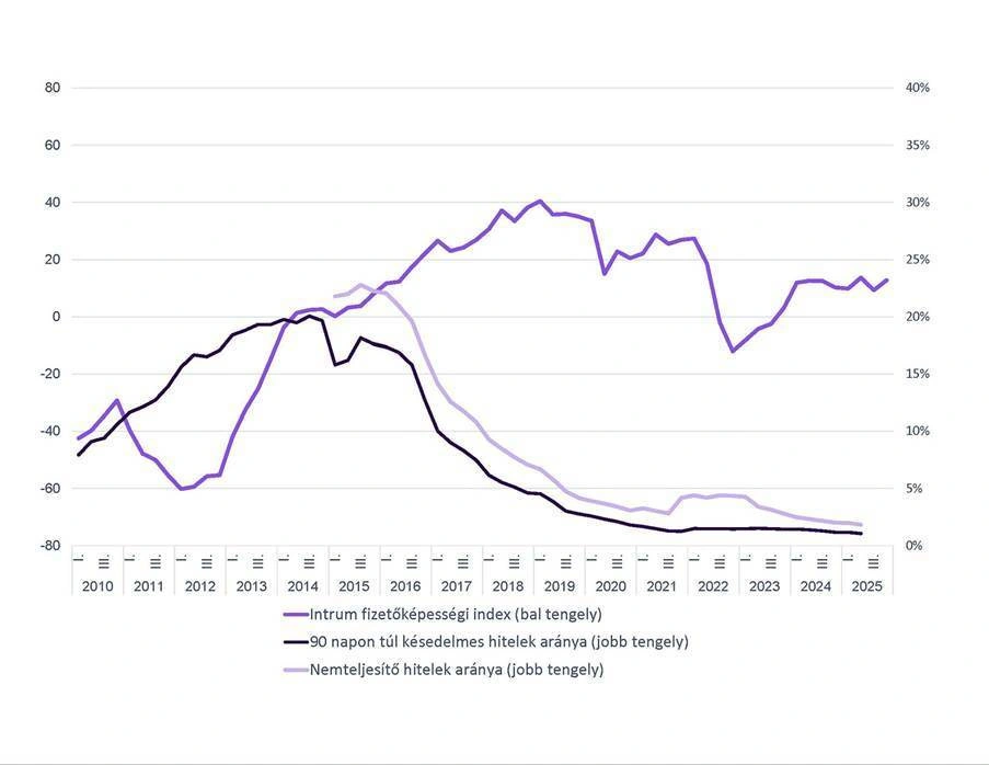 A 2025-ös év egészét tekintve az Intrum Index alakulása mérsékelten ingadozó pályát rajzolt ki. A második negyedév javulását a harmadik negyedévben visszafogottabb értékek követték. Az időszakban a korábbi várakozásoknak megfelelően a háztartások fizetőképessége átmenetileg enyhén romlott, majd a negyedik negyedévben ismételt emelkedés következett. Az év végére a jövedelmi, illetve likviditási oldal stabilizálódása rövid távon felülírta a lefelé mutató kockázatokat.