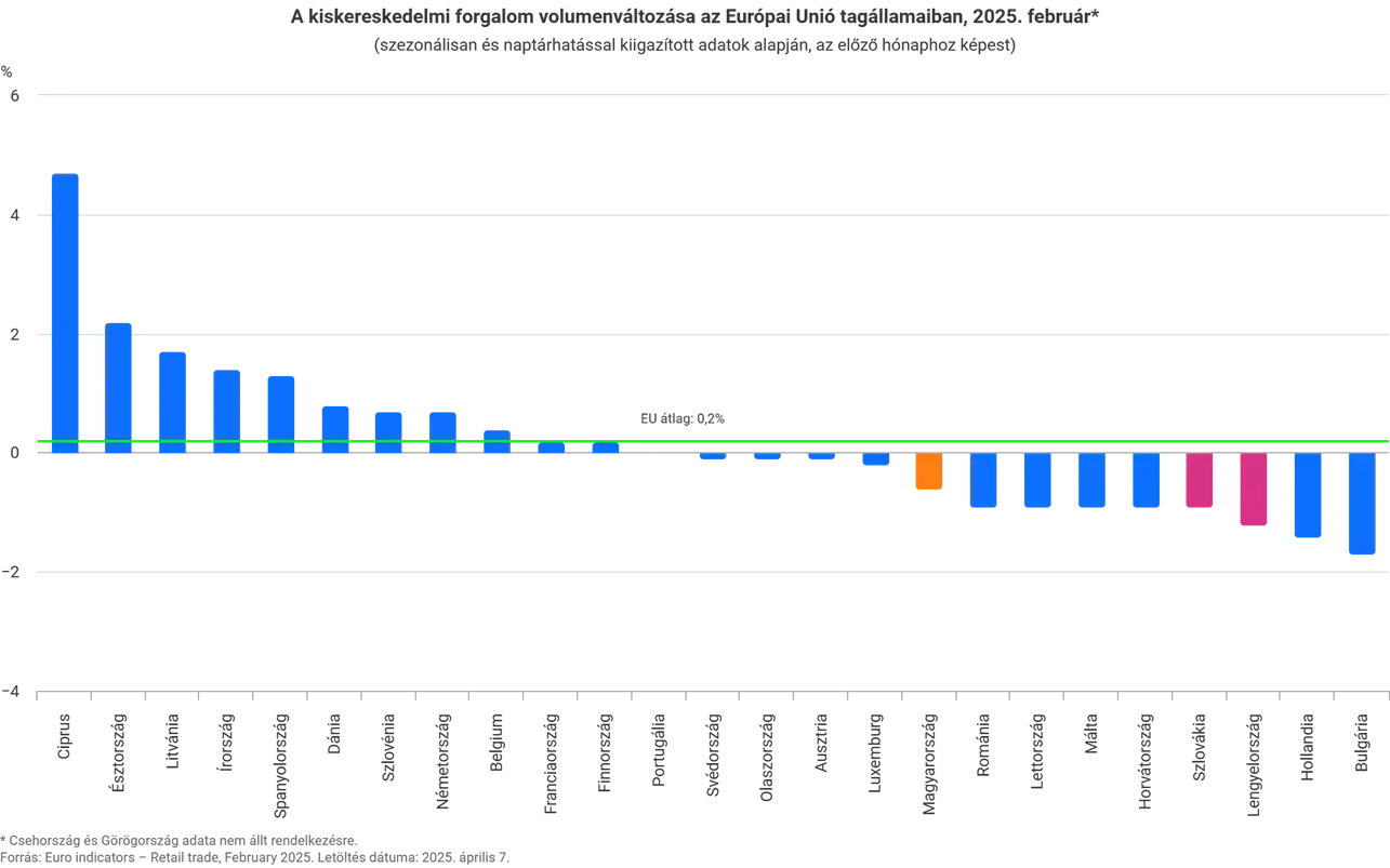 A kiskereskedelmi forgalom volumenének alakulása az Európai Unió tagállamaiban, 2025. február