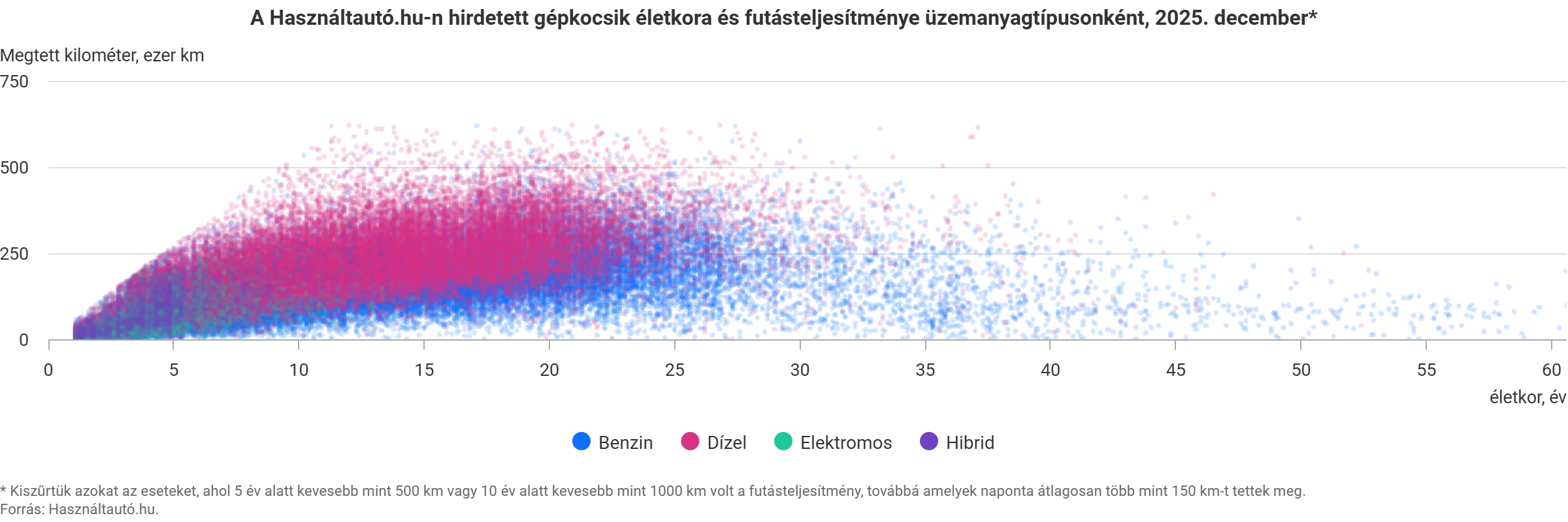 A futásteljesítmény és az életkor közötti összefüggés decemberben is jól kirajzolódott. A meghirdetett benzines autók átlagosan 154 ezer kilométert, míg a dízelek mintegy 220 ezer kilométert futottak, vagyis a dízelmeghajtású járművek közel 43%-kal nagyobb futásteljesítménnyel szerepeltek a kínálatban. A benzines autók átlagéletkora 13,5 év, a dízeleké 12,2 év volt. Éves összevetésben a dízelek futásteljesítménye stagnált, míg a benzineseké enyhén csökkent. A dízeles személygépjárművek átlagéletkorában egy év alatt 0,8%-os emelkedés, míg a benzinesek esetén 2,9 %-os csökkenés volt megfigyelhető.