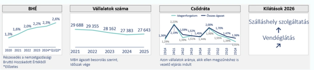 Szintén pozitívum, hogy az idegenforgalomban működő vállalatok számának hosszú időszak óta tapasztalt csökkenése megállt, és kismértékű növekedés történt 2024 decemberéhez képest az 2025 év végére. Az idegenforgalom bővülésének folytatódására számítunk 2026-ban is, összhangban a nemzetközi trendekkel. A hazai növekedést több tényező is támogatja: a reálbérek emelkedése, valamint az olyan juttatások, mint a családi adókedvezmény fokozatos megduplázása, illetve a két- és háromgyermekes édesanyák személyi jövedelemadó-kedvezménye.