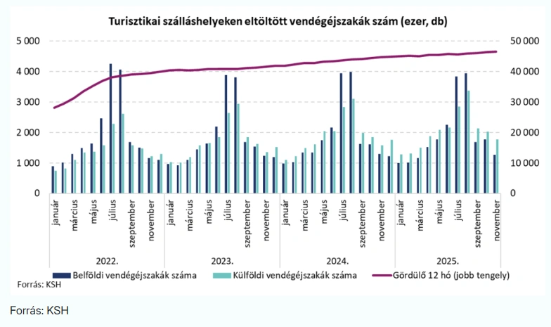 2025 novemberében is jól teljesített a turizmus szektor: 1,4 millió vendég 3 millió vendégéjszakát töltött el. A vendégek száma összességében 7,9, a vendégéjszakáké 5,8%-kal nőtt a turisztikai szálláshelyeken az egy évvel korábbihoz képest.
