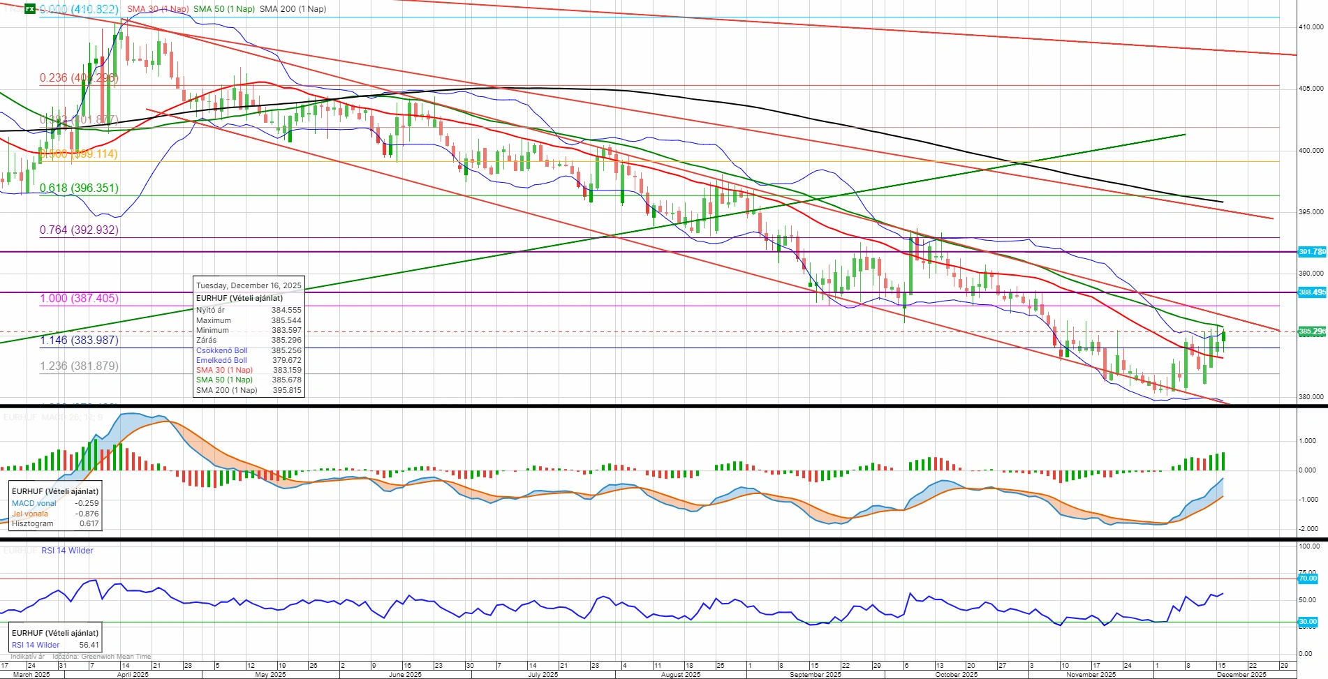 Támaszról fordult az euró-forint árfolyama. A kamatdöntés bejelentését követően átmenetileg a 384-es kulcsszint alá süllyedt az árfolyam, azonban a közlemény módosítása, illetve a sajtótájékoztató hangvétele miatt onnan felpattant a jegyzés. A következő meghatározó ellenállás az 50 napos mozgóátlag 385,68-nál, majd az április óta tartó csökkenő trendcsatorna felső trendvonala jelent nagyon fontos akadályt, jelenleg 386,50-nél. Amennyiben a későbbiekben áttörné az árfolyam ezt a trendvonalat, véget érhet a több mint 8 hónapja tartó csökkenő trend.