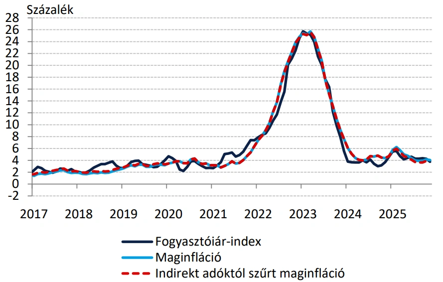 A toleranciasávba süllyedt a hazai infláció. Novemberben - nagyrészt a bázishatások miatt - 4 százalék alá került az éves bázison számított infláció, míg havi bázison mindössze 0,1 százalékos volt a fogyasztói árak emelkedése. A szolgáltatásinfláció továbbra is magas, éves bázison 6,5 százalékos volt, illetve a fogyasztással korrigált háztartási energia ára is felfelé húzta az inflációt, itt 9,8 százalékos drágulást mértek.