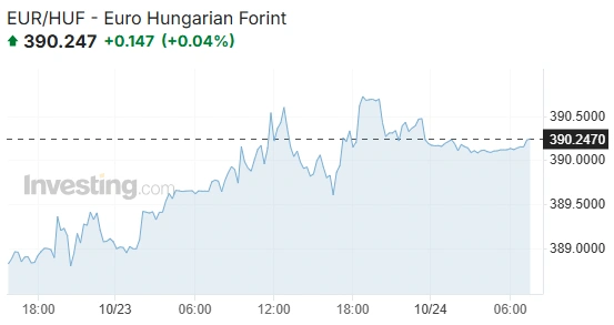A 43. heti hétfői kezdés óta a forint gyengült, 0,2 százalékkal az euróval és a svájci frankkal szemben és 0,6 százalékkal a dollár ellenében.