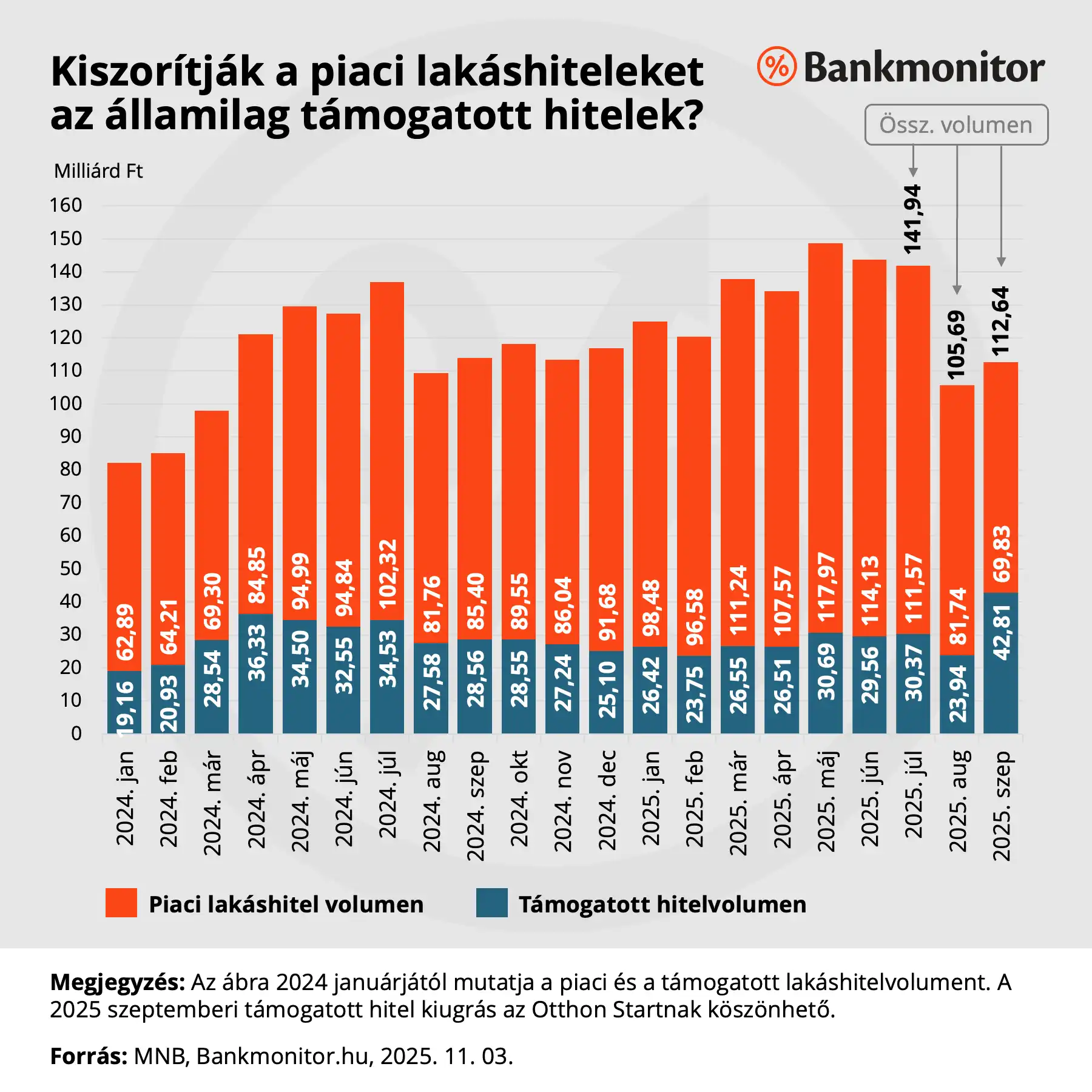 Ami igazán szembetűnő, hogy az ősz első hónapjában jelentősen megugrott a támogatott hitelek kihelyezése. Ennek köszönhetően a támogatott kölcsönök aránya elérte a 38%-ot a teljes hitelkihelyezésen belül – ez 2022 óta a legmagasabb érték.