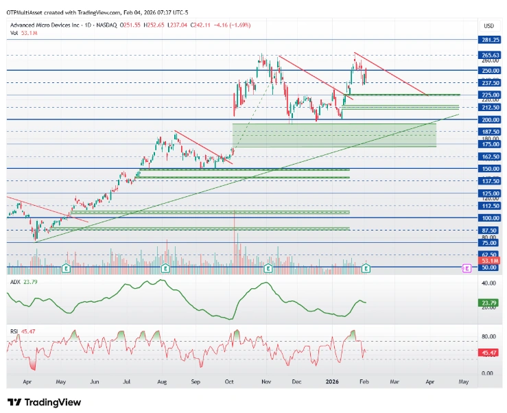 Az AMD idén 13%-os emelkedéssel felülteljesítőnek számított az amerikai részvénypiacon. A logikai chipeken belül elsősorban az adatközpontokban használt GPU-kat illetve számítógépekbe szükséges CPU-kat gyártó vállalattól azt várja a piac hogy mindkét szegmensben csökkentse a piaci részesedésben tapasztalható hátrányát a vezető szereplőkkel szemben (CPU-ban az Intel, GPU-ban az Nvidia mögött). A részesedésnyerés potenciálja, valamint a logikai chipek piacának várható bővülése együttesen kedvező növekedési kilátásokat teremt az AMD számára. Ez a javuló fundamentális kép az év elején több elemzőházat is célár-emelésre ösztönzött.