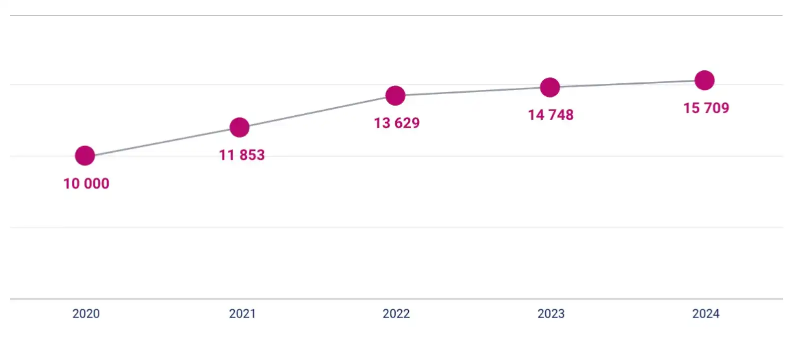A vizsgált területek közül a reklámügynökségi index 2020 óta több mint 60 százalékkal nőtt, de 2024-ben lassabb tempóra váltott. A mutató 16 145 pontnál állt meg, ami 3,5 százalékkal haladja meg a 2023-as év adatát.