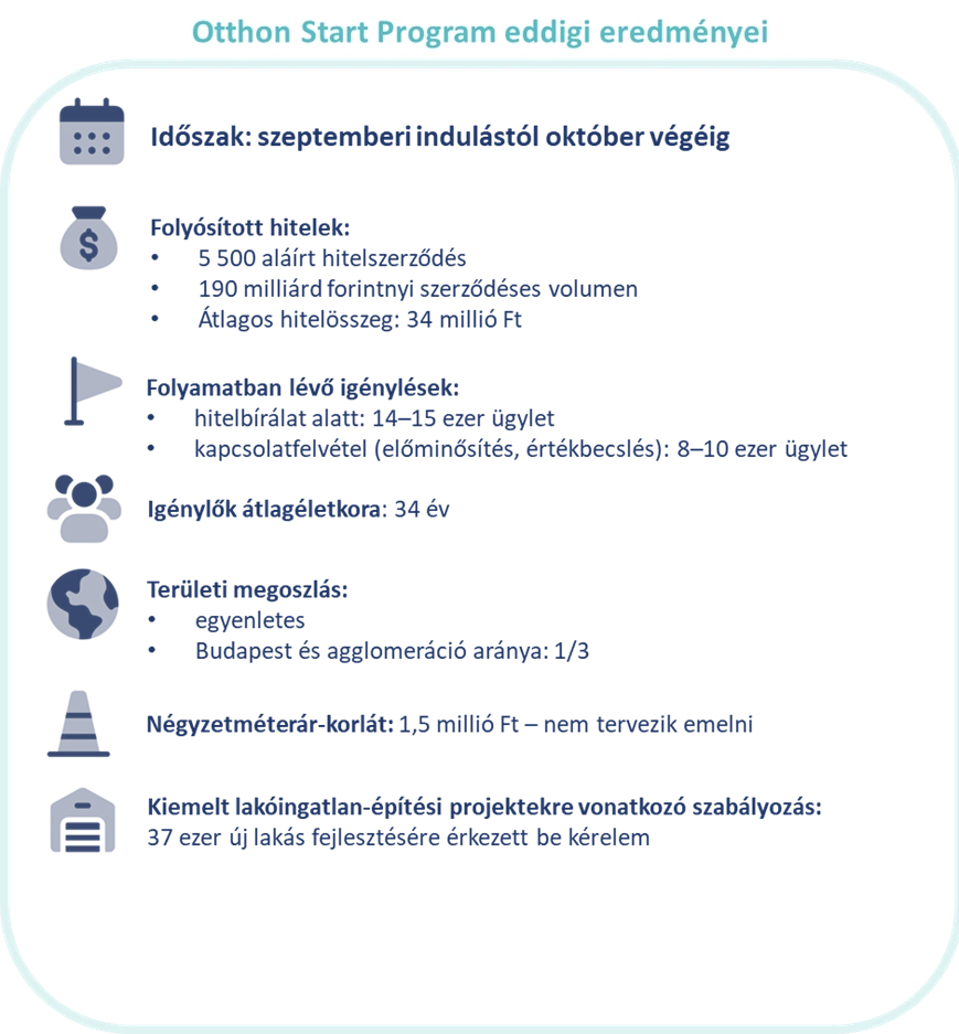 A szeptemberi értékesítési adatok alapján az Otthon Startnak köszönhetően mind Budapesten, mind vidéken az első lakásukat vásárló vevők uralták az ingatlanpiacot; a fővárosban a tranzakciók 39, míg vidéken 31 százaléka kapcsolódott a hitelprogramhoz. Az első lakásvásárlók által kiszemelt ingatlanok átlagára Budapesten 67,2 millió forint, az átlagos alapterület pedig 60 négyzetméter volt, míg vidéken 50 millió forint és 87 négyzetméter jellemezte a tipikus tranzakciókat.