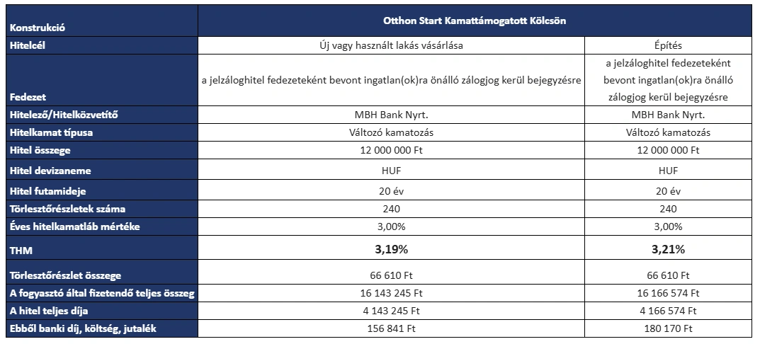 A Teljes hiteldíj mutató (THM) meghatározása az aktuális feltételek és a hatályos jogszabályok figyelembe vételével történt, ugyanakkor nem tartalmazza a fedezetül szolgáló ingatlanra vonatkozóan kötendő vagyonbiztosítás díját. A feltételek változása esetén a THM mértéke módosulhat. A THM értéke nem tükrözi a hitel kamatkockázatát. A hitel igényléséhez a fedezeti ingatlanra vonatkozóan vagyonbiztosítás és MBH Bankos fizetési számla megléte vagy fizetési számlaszerződés megkötése szükséges.