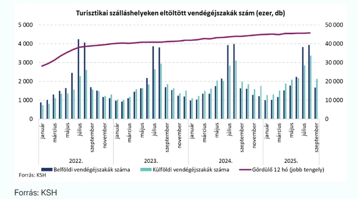 2025 szeptemberében is jól teljesített a turizmus szektor: 1,6 millió vendég 3,8 millió vendégéjszakát töltött el. A vendégek száma összességében 8,3, a vendégéjszakáké 5,6%-kal nőtt a turisztikai szálláshelyeken, az egy évvel korábbihoz képest.