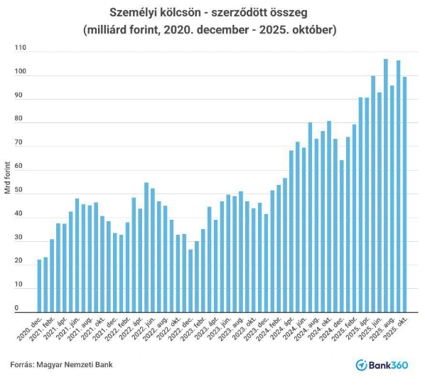 A személyi kölcsönök népszerűsége továbbra is töretlen, októberben 99,33 milliárd forintra szerződtek a magyar háztartások. Ez ugyan 7 százalékkal kevesebb, mint szeptemberben, a tavaly októberi eredményt azonban 23 százalékkal meghaladja. Összesen 30 194 darab személyi kölcsön szerződést kötöttek meg a hitelintézetek az igénylőkkel. Az átlagos hitelösszeg 3,29 millió forint volt.