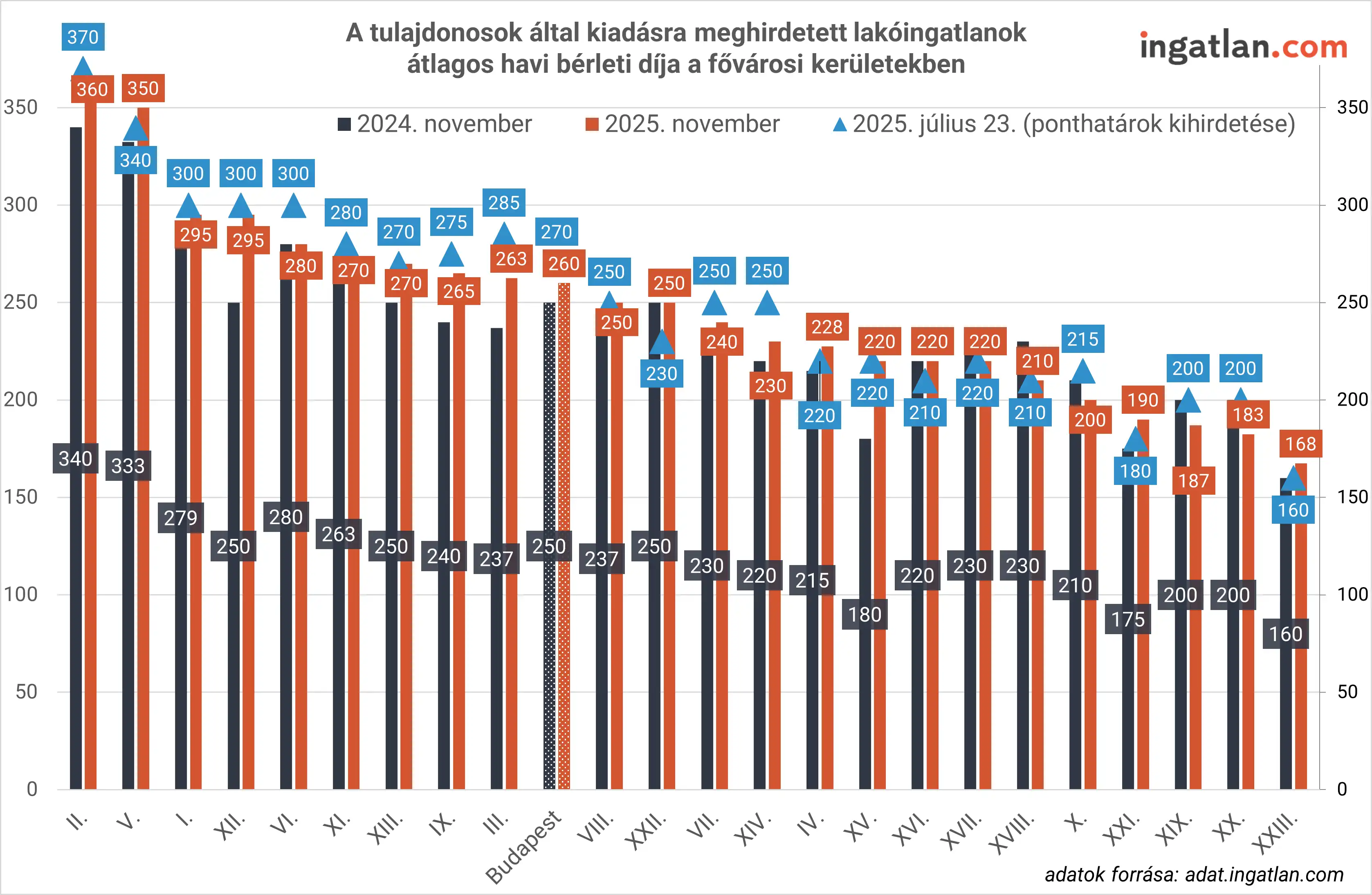 November elején a fővárosi kiadó lakások bérleti díjának középértéke 260 ezer forint volt. A legnagyobb kínálattal rendelkező kerületek közé tartozik a XIII. kerület, ahol lakbérek középértéke 270 ezer forint. Szintén széles kínálatot nyújt a XI. kerület és a II. kerület, előbbiben ugyancsak 270 ezer forint a bérleti díjak mediánja, utóbbiban viszont jóval magasabb, mégpedig 360 ezer forint. A IX. kerületben 265 ezer, a VIII.-ban 250 ezer forintos mediánlakbérek jellemzőek. A kúriai döntéssel érintett VI. kerületben 280 ezer forint a havi átlagos bérleti díj, ami 20 ezer forinttal kevesebb a július végi szintnél, és pont ugyanannyi, mint egy évvel ezelőtt. “Sokat elmond a fővárosi albérletpiac változásáról, hogy július vége óta a huszonháromból csupán hat kerületben tudtak emelkedni a bérleti díjak” - fogalmazott az ingatlan.com szakértője.