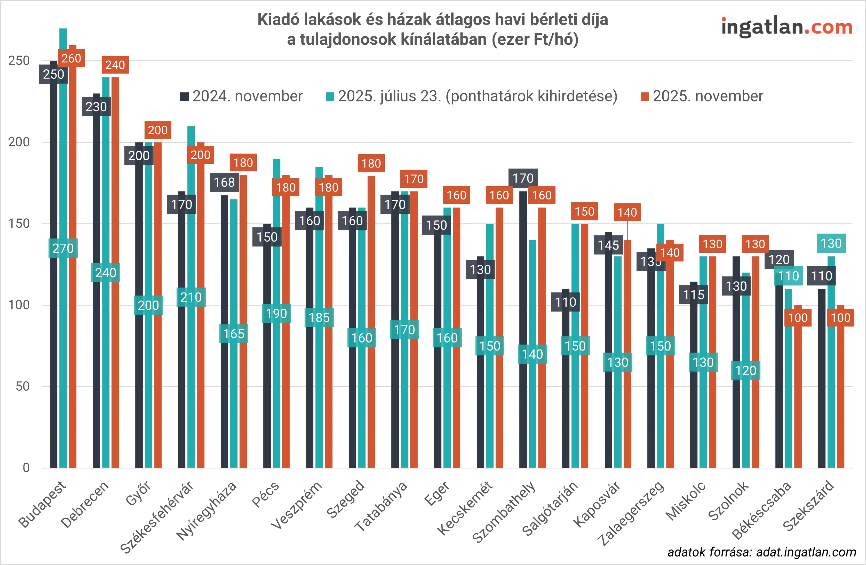 A vármegyeszékhelyek közül Debrecen áll az élen 240 ezer forintos középértékkel, Utána Győr és Székesfehérvár következik 200-200 ezer forintos értékkel. Veszprém, Pécs és Nyíregyháza egyaránt 180 ezer forintos mediánnal kezdte a novembert. A legolcsóbb vármegyeszékhelyek közé sorolható Békéscsaba és Szekszárd található, ahol a medián bérleti díj 100 ezer forint. Szolnokot és Miskolcot 130-130 ezer, Zalaegerszeget pedig 140 ezer forint körüli összeg jellemzi.