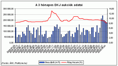 A korábbi heteknél alacsony meghirdetett összeg mellett, továbbra is magas érdeklődéstől övezve 29 bázisponttal 8,05 százalékra zuhant a 3 hónapos diszkont kincstárjegy (D091111) hozama az Államadósság Kezelő Központ (ÁKK) keddi aukcióján. (ProfitLine.hu)
