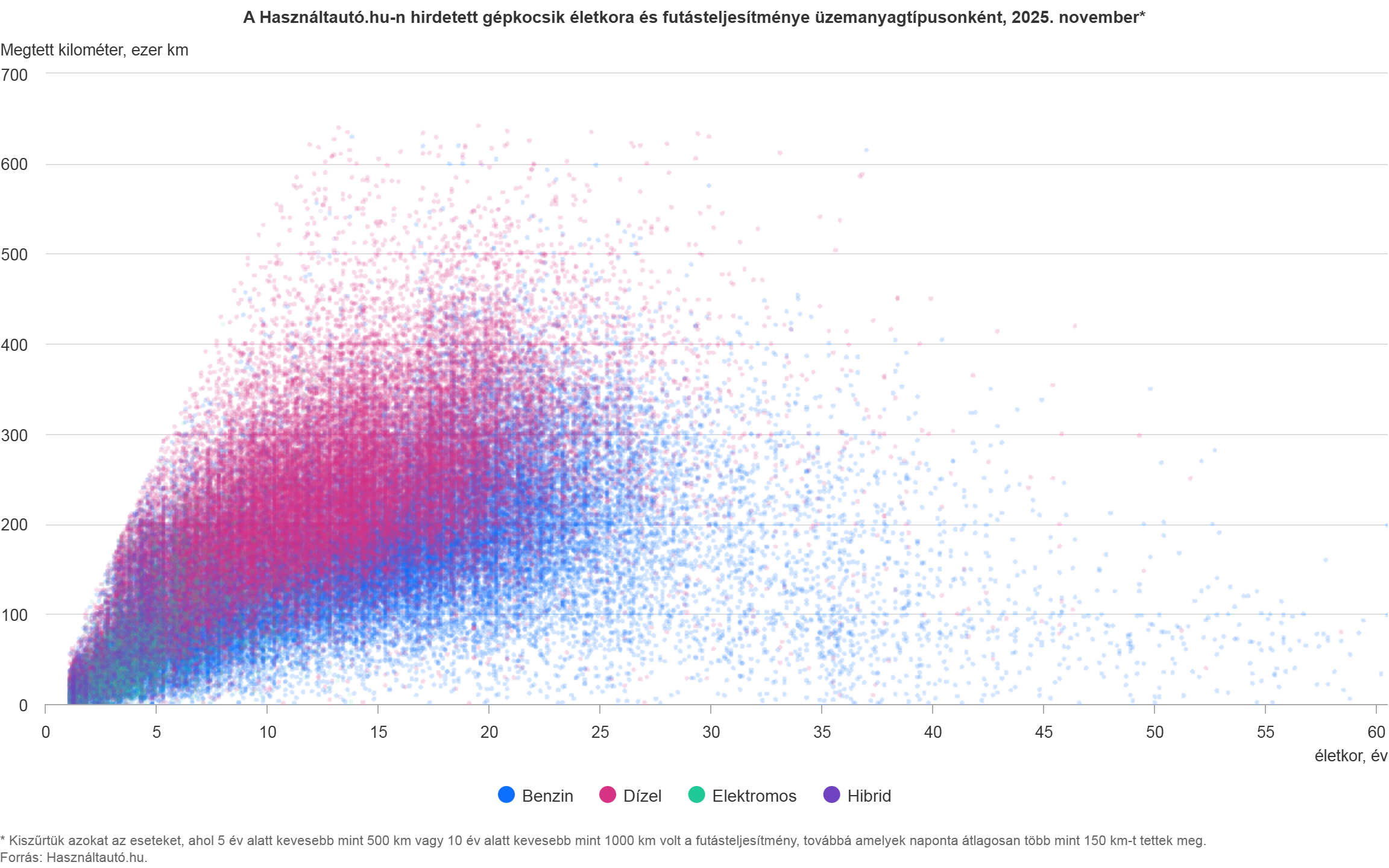 A novemberi kínálat közel felét, 55 560 darab hirdetéssel a benzinmeghajtású autók adták, míg a dízelek 46 610 darabbal a hirdetések 41,2%-át tették ki. A hibrid hajtású személygépkocsik 5150, az elektromos modellek pedig 5660 hirdetéssel szerepeltek a Használtautó.hu kínálatában.