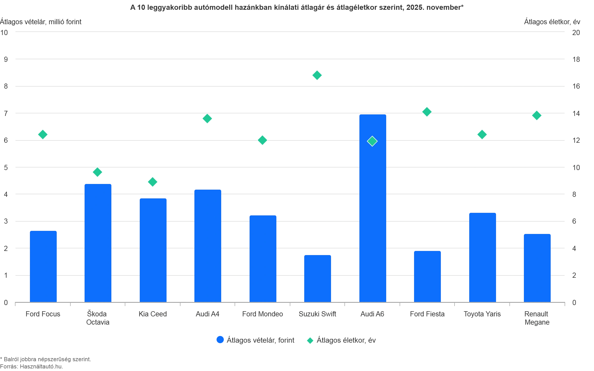 A Használtautó.hu-n 2025 novemberében meghirdetett 10 legnépszerűbb modell közül az Audi A6 átlagára volt a legmagasabb - 6,96 millió forint, a Suzuki Swifté pedig a legalacsonyabb - 1,75 millió forint. Életkor szerint átlagosan a Kia Ceed bizonyult a legfiatalabbnak 8,9 évvel, míg a Suzuki Swift volt a legidősebb, csaknem 16,8 év átlagéletkorral.