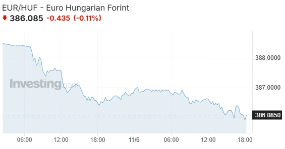 Az euró árfolyama a reggel hét órakor jegyzett 386,85 forintról 386,10 forintra csökkent 18 órakor, napközben 385,86 forint és 387,38 forint között mozgott.