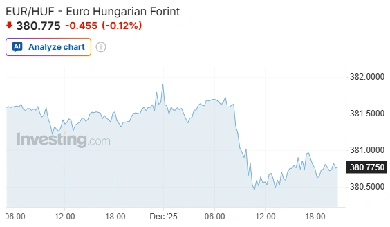 Az euró árfolyama a reggel hét órakor jegyzett 381,67 forintról 380,70 forintra csökkent 18 órakor, napközben 380,44 forint és 382,02 forint között mozgott.