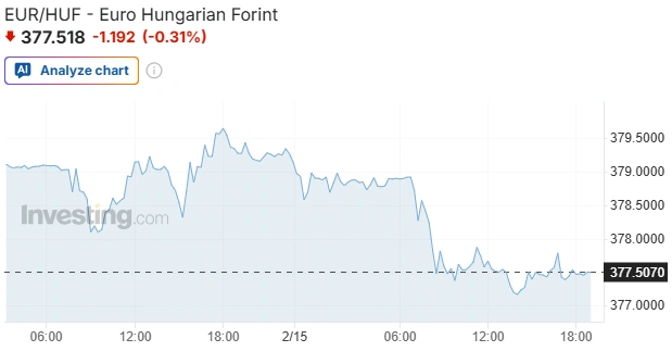 Az euró árfolyama a reggel hat órakor jegyzett 378,90 forintról 377,54 forintra csökkent 18 órakor, napközben 377,07 forint és 379,14 forint között mozgott.
