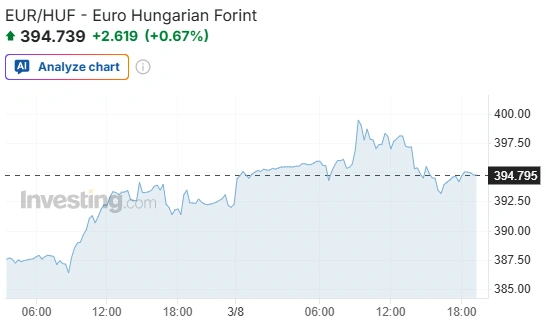 Az euró árfolyama a reggel hat órakor jegyzett 395,99 forintról 394,09 forintra csökkent 18 órakor, napközben 392,59 forint és 399,91 forint között mozgott.