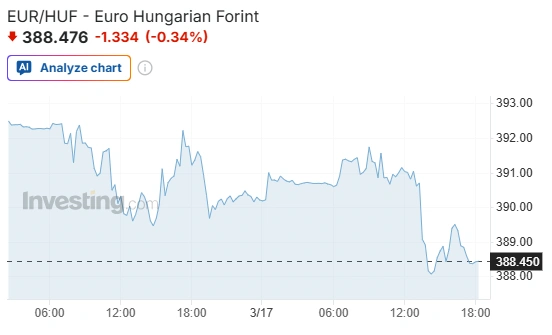 Az euró árfolyama a reggel hét órakor jegyzett 391,34 forintról 388,46 forintra csökkent 18 órakor, napközben 387,79 forint és 391,97 forint között mozgott.