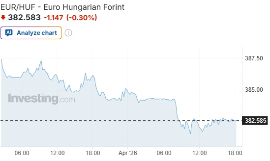 Az euró árfolyama a reggel hét órakor jegyzett 384,27 forintról 382,65 forintra csökkent 18 órakor, napközben 381,40 forint és 385,51 forint között mozgott.