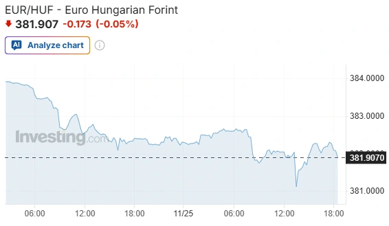 Este hat órakor az eurót 382,31 forinton jegyezték a kora reggeli 382,58 forint után, a dollár jegyzése 330,82 forintra csökkent 332,24 forintról, a svájci franké pedig 409,02 forintra ment lejjebb 410,57-ről. A forint kedden 0,1 százalékkal erősödött az euróval és 0,4 százalékkal a dollárral és a svájci frankkal szemben.
