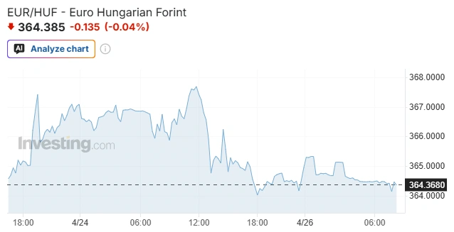 A forint az előző, 17. heti kezdésnél 0,8 százalékkal áll gyengébben az euróval, 1,1 százalékkal gyengébben a dollárral és 0,8 százalékkal gyengébben a svájci frankkal szemben.
