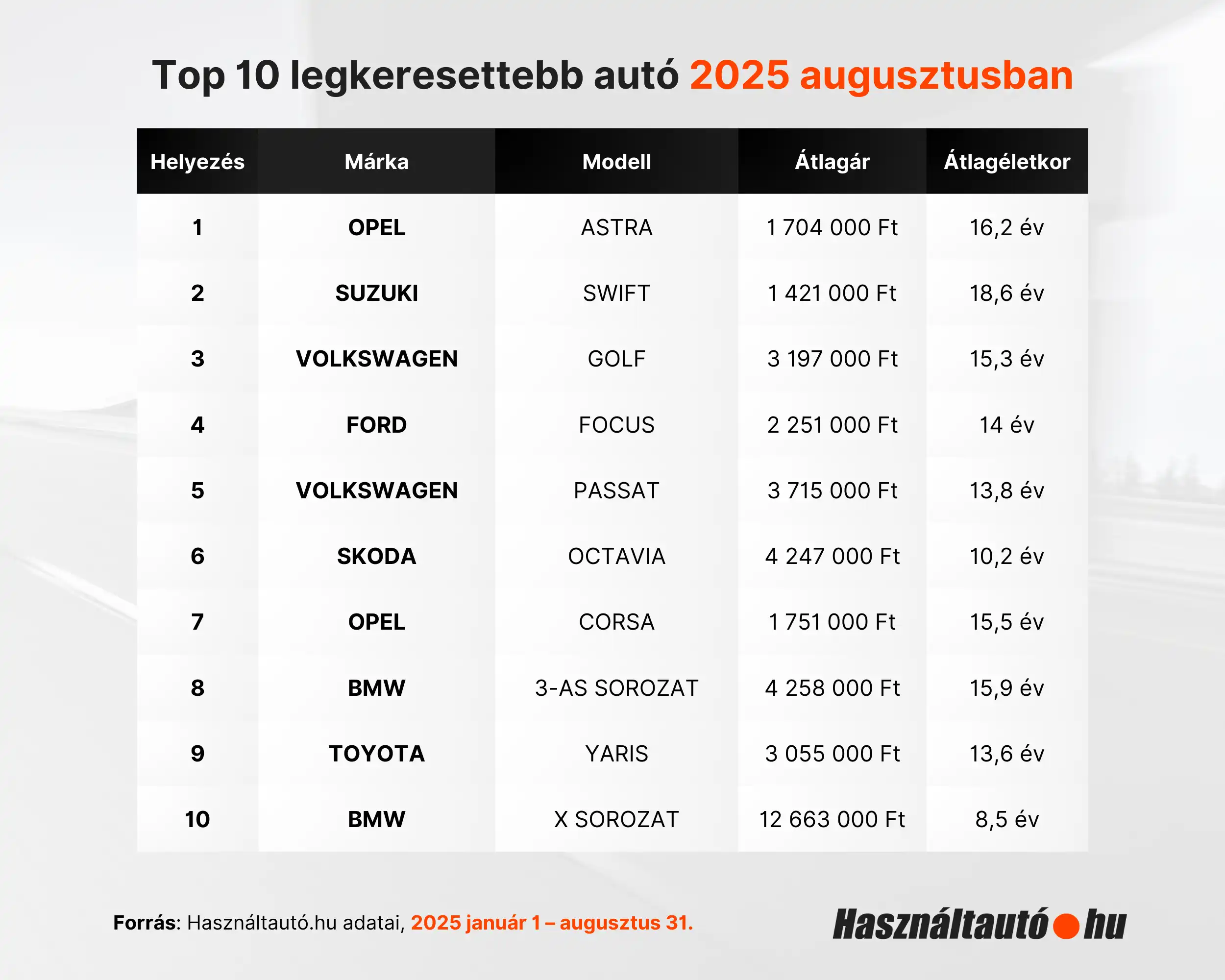 „A nyári szünet után újra élénkülés tapasztalható a használtautó-piacon: nőtt az érdeklődések száma, miközben az átlagéletkor és a futásteljesítmény enyhén csökkent. A toplista is változott: a Škoda Octavia és az Opel Corsa előrelépésével a BMW 3-as a 8. helyre szorult vissza. A dobogón azonban nincs meglepetés, továbbra is az Opel Astra, a Suzuki Swift és a Volkswagen Golf vezetik a rangsort a hazai vásárlók körében." – mondta Koralewsky Márk, a Használtautó.hu üzletágvezetője.