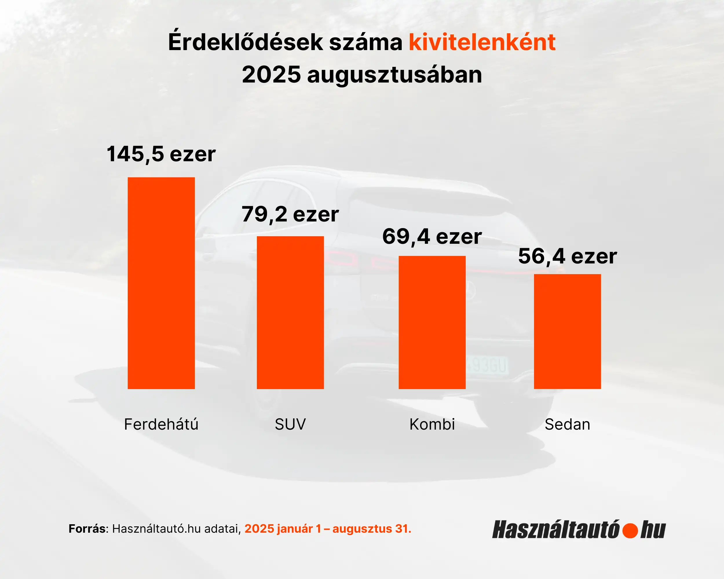 A kivitelek versenyében továbbra is magabiztosan vezet a ferdehátú, de a városi terepjárók (SUV-ok) júliusi előretörése kitartott: már többen (kb. 79000-en) vennének ilyet, mint kombi autókat (kb. 69000 érdeklődő). Az átlagárak minden kivitel esetében növekedtek mind az elmúlt hónapot, mind 2024 augusztusát nézve. Ferdehátú autókat átlagosan 2,6 millióért, kombikat 4,8 millióért, SUV-okat 8,9 millióért, szedánokat pedig 5,6 millióért vehetünk. Életkor és futásteljesítmény tekintetében elhanyagolható a különbség.