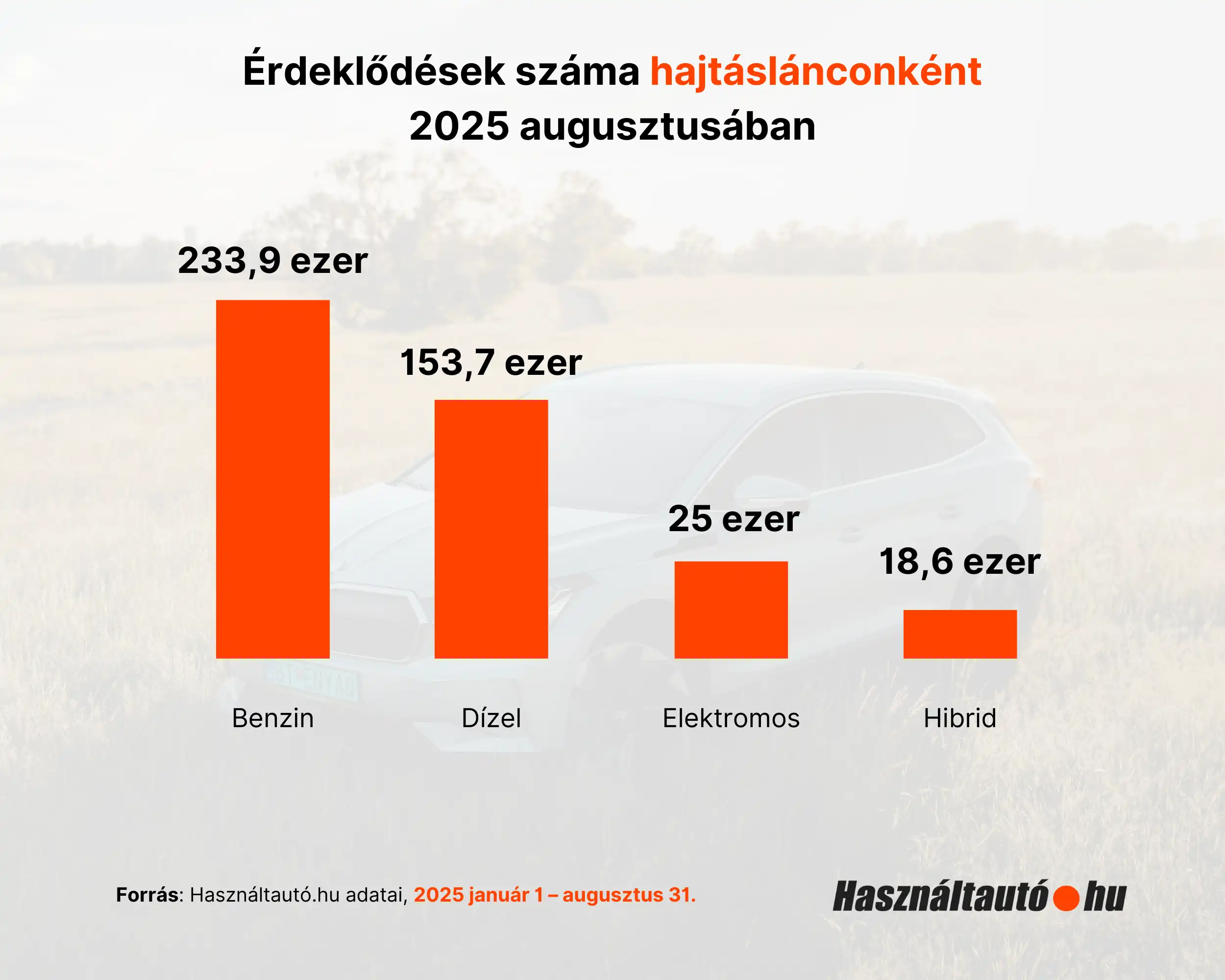 A nyár végének közeledtével ismét fellendül a használt autók piaca. 2025 augusztusában mintegy 11 százalékkal több érdeklődés érkezett a Használtautó.hu-n, mint júliusban, és 5%-kal többen fontolgatják az autóvásárlást, mint az elmúlt év azonos időszakában. Egy kicsivel, 3%-kal nőtt a hirdetések száma, és felfelé tolódtak a vételárak is: míg tavaly ilyenkor átlagosan 4,7 millió forintért, a múlt hónapban pedig átlagosan 5,1 millióért kínáltak járműveket eladásra, most már 5,3 millió forint az átlagár. Ezzel együtt viszont ha nem is sokkal, de valamivel csökkent az átlagéletkor és a futásteljesítmény: 13,04 helyett 12,89 éves autók közül válogathatunk, és 178 ezer kilométer helyett 176 ezer kilométert tettek meg az eladó kocsik átlagosan.