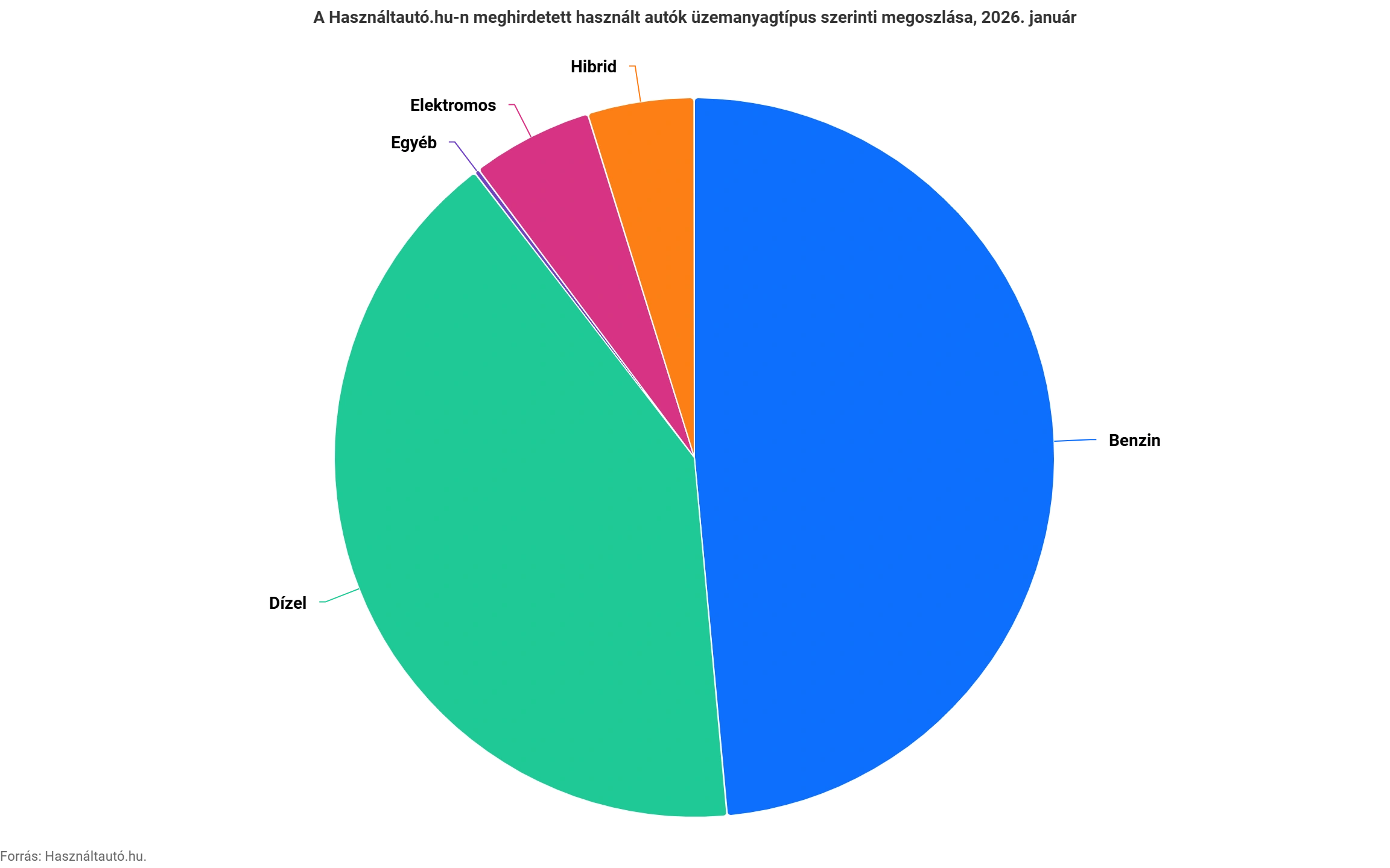 A meghirdetett személygépkocsik közel fele, mintegy 50 040 darab benzinmeghajtású volt, míg a 42 250 dízelautó 41%-ot képviselt a kínálatban. Az alternatív hajtású járművek részesedése továbbra is alacsonyabb, az elektromosok a kínálat 5,4%-át, a hibridek pedig 4,8%-át teszik ki. A Használtautó.hu kínálatában az előző év azonos időszakához viszonyítva az elektromos meghajtású autók száma 23,3%-kal, a hibrideké 15,5%-kal nőtt. Ezzel párhuzamosan a benzinmeghajtásúaké 1,9%-kal, a dízelmeghajtású autók száma pedig 5,1%-kal csökkent.