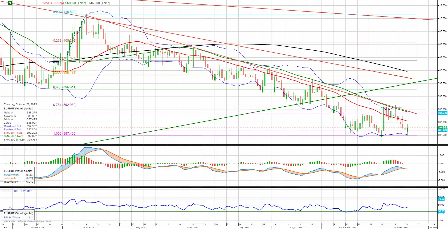 Fontos támasznál az euró-forint árfolyama. A 388,50-es szint megtartotta a jegyzést az elmúlt napokban, onnan kapaszkodik felfelé az árfolyam. Fontos rövid távú ellenállási szintek 390-nél, majd 390,23-nál a 30 napos mozgóátlag. Az igazán fontos ellenállások 392 felett húzódnak, az 50 napos mozgóátlag, illetve az április óta tartó csökkenő trendvonal, ezek szignifikáns áttörése esetén érne véget a többhónapos csökkenő trend.