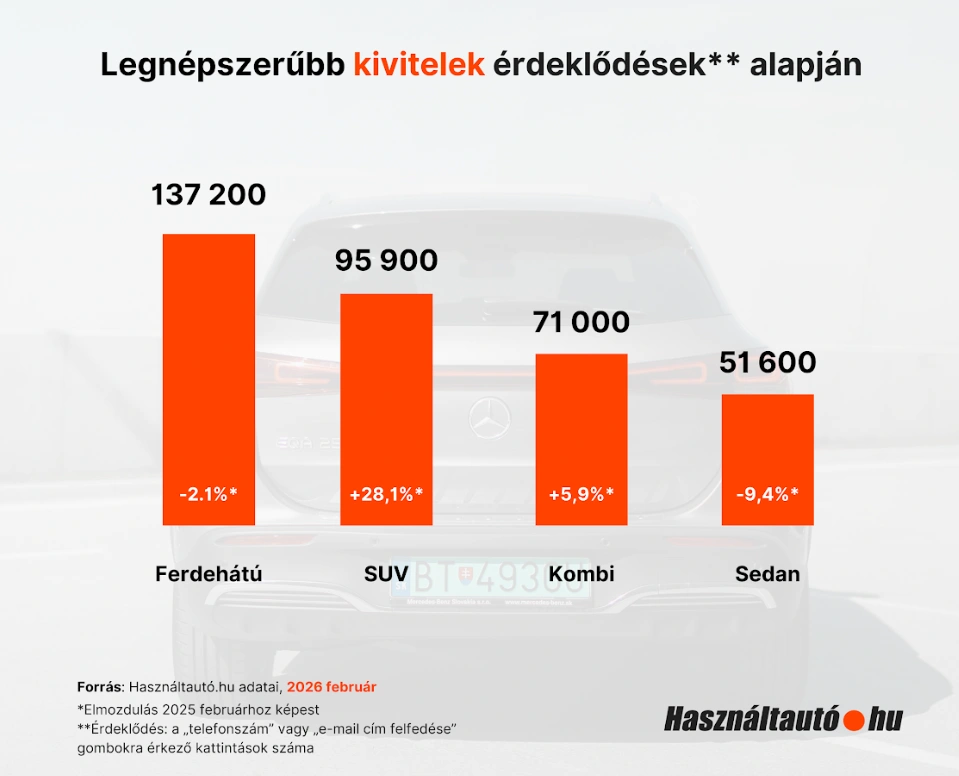 A Használtautó.hu legfrissebb adatai szerint 2025 februárjához képest mintegy 16 ezerrel több, összesen 442 212 db megkeresés érkezett 2026 februárjában. Ugyan a ferdehátúak továbbra is a legkeresettebb kivitelű autóknak számítanak, az SUV-k térnyerése folytatódik: 28,1%-kal többen, 95900-an kerestek városi terepjárókat az év második hónapjában, mint az elmúlt év azonos időszakában. A kombik és a sedanok esetében nincs jelentős eltérés: előbbiek 71000-rel, 5,9%-os növekedés után a harmadikak, míg utóbbiak 51600-zal, 9,4%-os csökkenés után állnak a negyedik helyen.