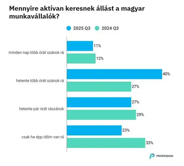 A Profession.hu, Magyarország piacvezető állásportálja legfrissebb, harmadik negyedévre vonatkozó trendjelentése alapján jelenleg a 18-65 év közötti, hazai munkavállalók közel fele (46%) keres új munkahelyet, vagy nyitott új állás lehetőségére. Miközben a munkavállalói aktivitás továbbra is élénk, a meghirdetett állások száma több mint 15%-kal visszaesett az előző év azonos időszakához képest. „Az üres pozíciókért folytatott fokozódó verseny következtében egyre hosszabb időbe telik a váltás. Idén átlagosan öt hónap alatt találták meg új munkahelyüket azok, akik az elmúlt egy évben váltottak – ez negyedével több idő, mint tavaly ilyenkor, amikor még négy hónap volt a jellemző. Tapasztalataink alapján az álláskeresési időt lerövidítheti többek közt, ha célzottan az adott hirdetésre szabjuk önéletrajzunkat. Ezek megírásához segítséget nyújt például az oldalunkon található, megújult önéletrajzkészítő szolgáltatásunk” – emelte ki Dencső Blanka, a Profession.hu piackutatási és üzletfejlesztési szakértője.