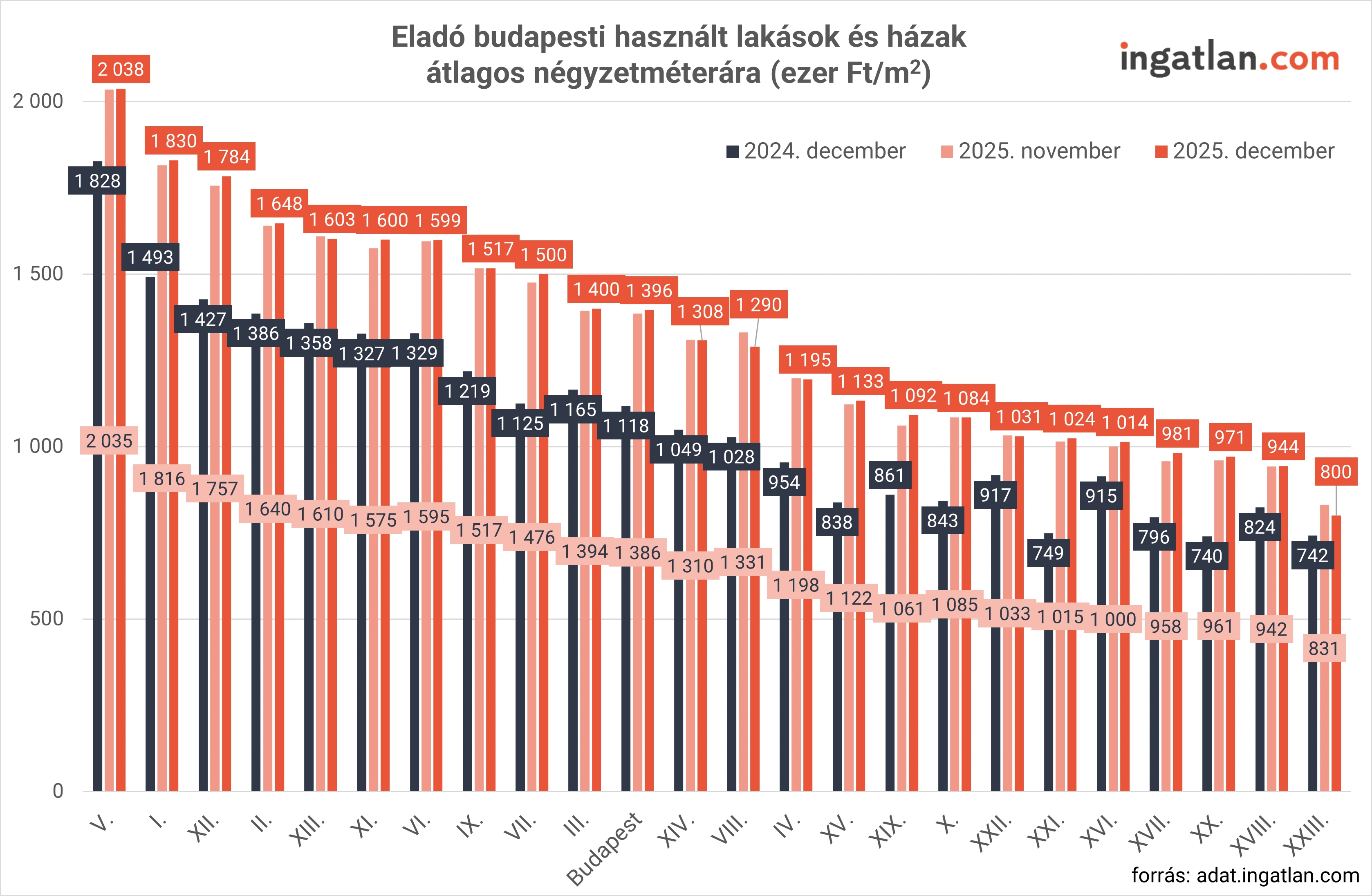 A kínálati piacot nézve Budapesten a használt lakóingatlanok esetében négyzetméterenkénti mediánérték közel 1,4 millió forint volt. Az V. kerület a legdrágább 2 millió forint feletti összeggel, a második és harmadik helyen van az I. és a XII. kerület, előbbinél 1,83 millió, utóbbinál 1,78 millió forint volt a négyzetméterárak középértéke december elején. A legolcsóbb városrészekben, azaz a XVII., a XVIII., a XX. és a XXIII. kerületben ugyanakkor 800 ezer és 981 ezer forintos mediánnal számolhatnak a lakásvásárlást tervezők.