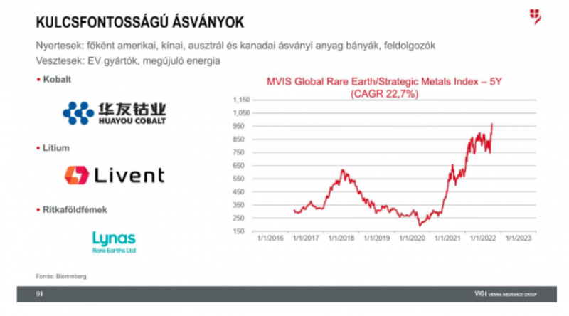 Jó példa erre az elektromos autózásba történő gyors és erőltetett átmenet, ami komoly szűkösséget eredményezett néhány nyersanyag piacán. És ez a folyamat még messze nem ért véget; becslések szerint az elektromos autózáshoz és a megújuló energiatermeléshez szükséges kulcsfontosságú ásványok kereslete a következő harminc évben a hatszorosára emelkedhet. Ilyen ásvány a lítium, a kobalt, a nikkel, a réz, vagy a ritka földfémek. Miközben egy hagyományos autóhoz nagyjából 40 kilogrammra van szükség ezekből az ásványokból, az elektromos autóknál ez eléri a 200 kilogrammot. De ezt a keresletet növelik a nap- és szélerőművek, valamint az atomenergiai beruházások is.