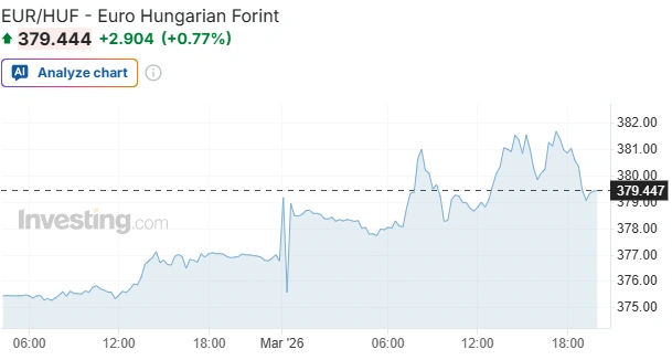 Az euró árfolyama a reggel hét órakor jegyzett 377,86 forintról 380,96 forintra emelkedett 18 órakor, napközben 377,78 forint és 381,96 forint között mozgott.