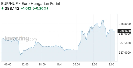 Az euró árfolyama a reggel hét órakor jegyzett 387,38 forintról 388,20 forintra emelkedett 18 órakor, napközben 387,10 forint és 388,78 forint között mozgott.