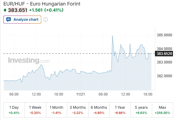 Este hat órakor az eurót 383,41 forinton jegyezték a kora reggeli 382,26 forint után, a dollár jegyzése 333,36 forintra ment fel 331,34 forintról, a svájci franké pedig 412,00 forintra 411,80-ról.
