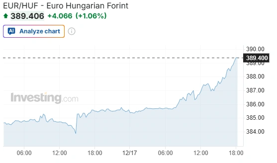 Az euró árfolyama a reggel hat órakor jegyzett 385,72 forintról 389,15 forintra emelkedett 18 órakor, napközben 385,28 forint és 389,33 forint között mozgott.