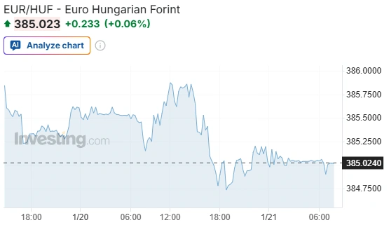 Az euró hét órakor 384,92 forinton állt, magasabban a kedd esti 384,78 forintnál. A dollár jegyzése 327,81 forintról 328,54 forintra emelkedett, a svájci franké pedig 415,33 forintról 415,34 forintra változott.