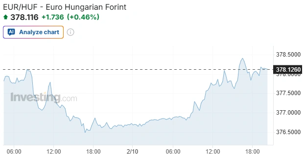 Az eurót este hat órakor 378,00 forinton jegyezték a kora reggeli 376,90 forint után. A dollár jegyzése 317,45 forintra ment fel 316,59 forintról, a svájci franké pedig 414,40 forintra 412,58 forintról.