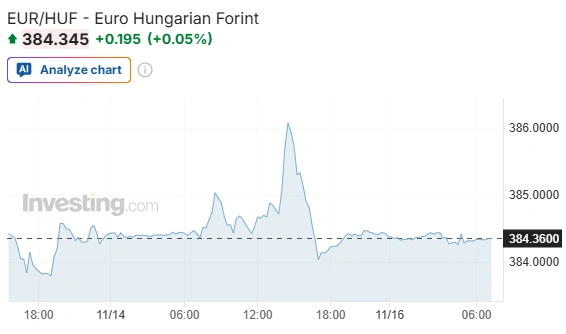 Hétfő reggeli jegyzésén a forint vegyesen állt a három devizával szemben az egy héttel korábbi, 46. heti kezdéshez képest: alig változott a jegyzése az euróval szemben, 0,4 százalékkal erősödött a dollár ellenében és 1,0 százalékkal gyengült a svájci frankkal szemben.