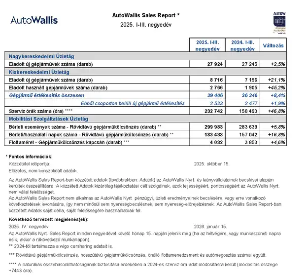 Tovább erősödött az AutoWallis Csoport teljesítménye a gépjármű-értékesítés terén 2025. harmadik negyedévében: 8,4 százalékkal több, összesen 39.406 darab járművet adott el a Csoport az előző év azonos időszakához képest, jelentősen meghaladva ezzel az első félévben mutatott 3,4 százalékos bővülést. A növekedés motorja továbbra is az AutoWallis Kiskereskedelmi Üzletága volt, amely 21,1 százalékkal 8.716-ra növelte újgépjármű-eladásait, míg a használtautó-eladások 2.766 darabra nőttek (+45,2%). Az üzletág annak ellenére teljesített jól, hogy a bázisidőszakban egyedi hatások – a japán márkák (Toyota, Suzuki, Nissan) tavaly márciusban záródó kampányai – miatt az akkori időszakban jelentősen megugrott az értékesítés. Az újgépjármű-eladások növekedéséből 1.400 darab a tavaly lezárt cseh akvizícióknak – az NC Auto (Stratos) három BMW márkakereskedése, valamint a Milan Král Group felvásárlása –, továbbá a tavaly ősszel nyitott budapesti Renault és Dacia kereskedés értékesítéseinek köszönhető. A szervizórák száma 46,8 százalékkal 232.742 órára emelkedett az év első kilenc hónapjában.