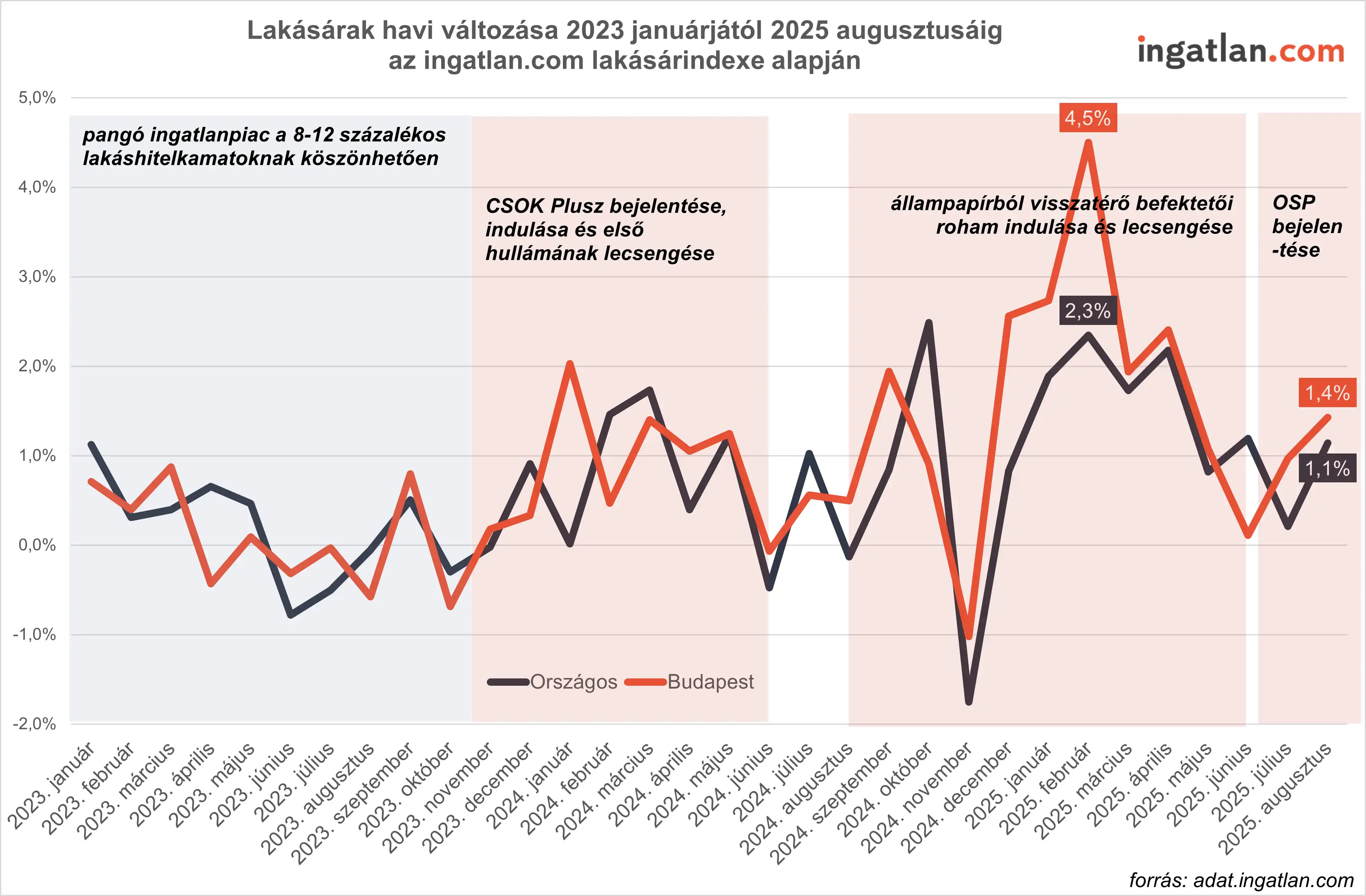 Az ingatlan.com adatai szerint a lakáspiac egyértelműen élénkül: nő a kereslet, gyorsul az áremelkedés üteme, miközben a kínálat szűkül, különösen az Otthon Start program keretében elérhető lakások esetében. Az áremelkedés tempója viszont még elmarad a 2025 elején tapasztalt árrobbanástól, mivel akkor a havi drágulás üteme országosan és Budapesten is bőven 2 százalék felett mozgott, július-augusztusban viszont még nem érte el az 1,5 százalékot sem.