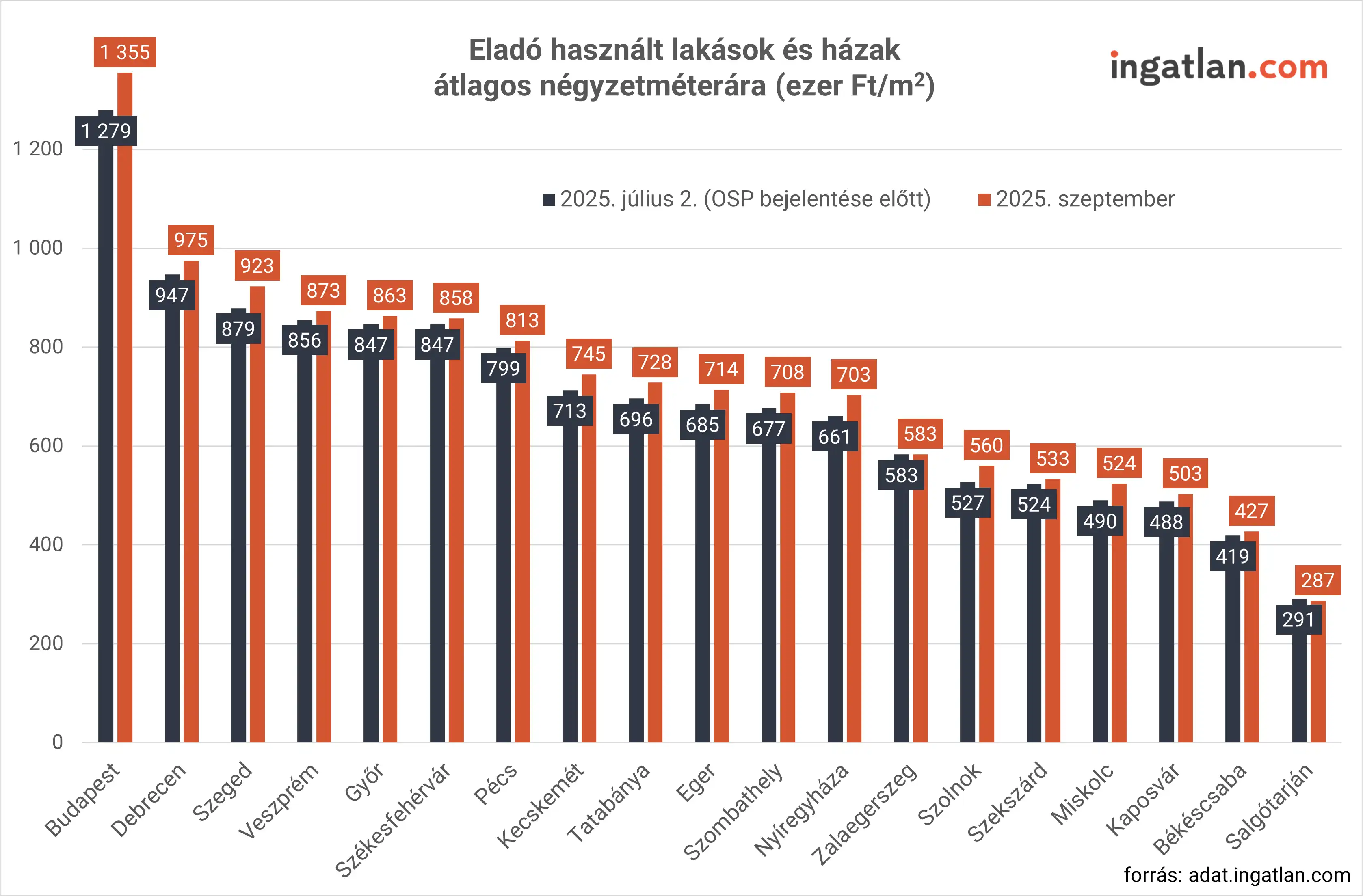 Az eladó használt lakások és házak árszintje is tovább emelkedett. Budapesten az eladó használt lakások és házak négyzetméterárainak középértéke szeptemberben elérte 1,36 millió forint. Ugyanez az érték július elején még 1,28 millió forint volt. A vármegyeszékhelyeken most 771 ezer forint az összesített medián négyzetméterár, ami júliusban még 748 ezer forint volt.